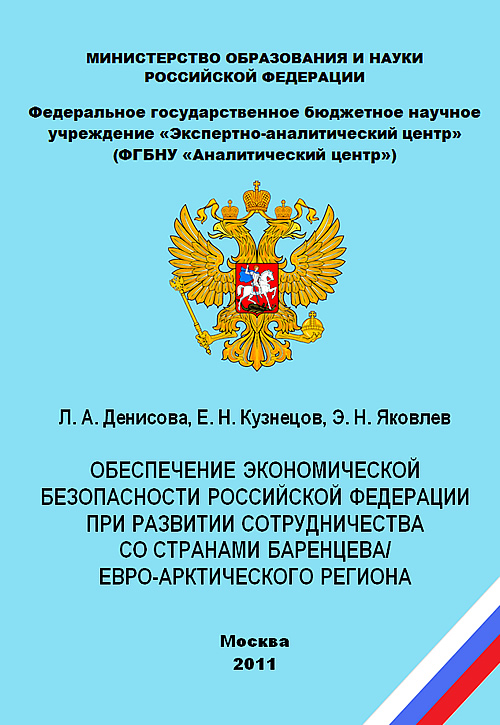 Год публикации: 2011 Денисова Л. А. Обеспечение экономической безопасности Российской Федерации при развитии сотрудничества со странами Баренцева/Евро-Арктического регионаМонография / Л. А. Денисова, Е. Н. Кузнецов, Э. Н. Яковлев; под общ. ред. д-ра экон. наук, проф. Э.Н. Яковлева. – М.: ФГБНУ «Аналитический центр» Минобрнауки России, 2011. – 46 с. (ISBN 978-5-904670-14-6). В работе рассматриваются проблемные аспекты обеспечения экономической безопасности Российской Федерации при международном взаимодействии в рамках Баренцева/Евро-Арктического региона; проводится анализ концептуальных принципов решения задач экономического и экологического внутрирегионального сотрудничества, призванного обеспечивать политическую и экономическую стабильность в регионе.