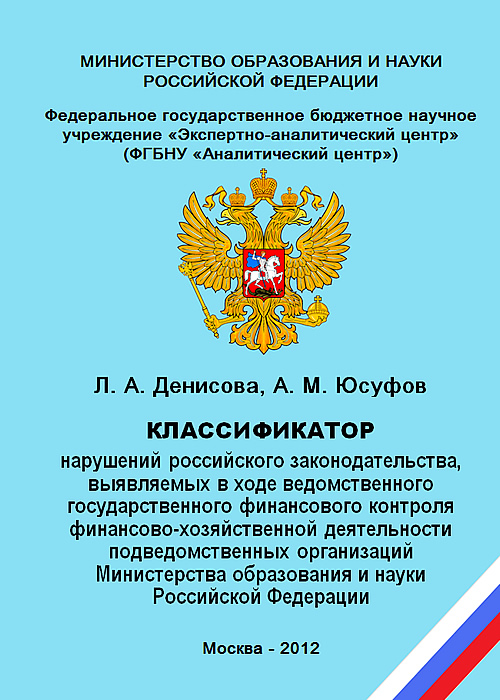 Год публикации: 2012 Денисова Л. А. Классификатор нарушений российского законодательства, выявляемых в ходе ведомственного государственного финансового контроля финансово-хозяйственной деятельности подведомственных организаций Министерства образования и науки Российской ФедерацииМонография / Л. А. Денисова, А. М. Юсуфов; под ред. д-ра экон. наук, проф. Э.Н. Яковлева. – М.: ФГБНУ «Аналитический центр» Минобрнауки России, 2012. –75 с. (ISBN 978-5-904670-17-7). Монография посвящена актуальной проблеме совершенствования контроля использования бюджетных средств образовательными и научными учреждениями Минобрнауки России. На основе комплексного исследования существующей классификации нарушений, используемой Счётной палатой России в ходе государственного финансового контроля, и практических результатов ведомственного мониторинга финансово-хозяйственной деятельности авторами предлагается Классификатор нарушений российского законодательства, выявляемых в ходе внутриведомственного государственного финансового контроля финансово-хозяйственной деятельности подведомственных организаций Министерства образования и науки Российской Федерации. Предназначена для членов экспертных комиссий по проверке финансово-хозяйственной деятельности учреждений образования и науки, а также для научных сотрудников, специалистов и руководителей, занимающихся проблемами государственного финансового контроля.