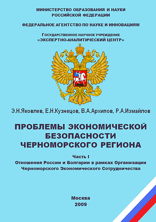 Год публикации: 2009 Яковлев Э. Н. Проблемы экономической безопасности Черноморского региона. Часть 1. Отношения России и Болгарии в рамках Организации Черноморского Экономического СотрудничестваМонография / Э. Н. Яковлев, Е. Н. Кузнецов, В. А. Архипов, Р. А. Измайлов; под общ. ред. д-ра экон. наук, проф. Э. Н. Яковлева. – М.: Государственное научное учреждение «Экспертно-аналитический центр», 2009. – 130 с. (ISBN 978-5-904670-02-3). В работе рассматривается история, современное состояние и перспективы развития на ближайшее будущее двусторонних политических и социально-экономических отношений Российской Федерации и Республики Болгария в рамках Организации Черноморского Экономического Сотрудничества с учётом воздействия последствий мирового финансового кризиса и прихода к власти в Болгарии нового правительства, существенно изменившего курс проводимой экономической политики, в том числе в отношении крупномасштабных российско-болгарских энергетических проектов.