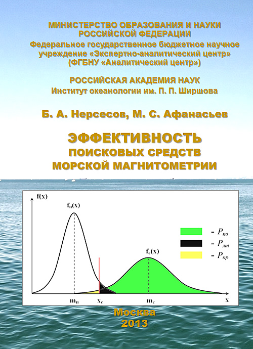 Год публикации: 2012 Нерсесов Б. А. Эффективность поисковых средств морской магнитометрииМонография [Институт океанологии им. П. П. Ширшова] / Б. А. Нерсесов, М. С. Афанасьев. – М.: ФГБНУ «Аналитический центр» Минобрнауки России, 2012. – 147 с. (ISBN 978-5-904670-21-4). В монографии рассматриваются основные направления развития поисковых магнитометрических средств, а также вклад данных морской магнитометрии в информационное поле придонного пространства. Анализируются перспективные пути развития отечественных и зарубежных магнитометрических систем. Проведена классификация физических моделей подводных объектов, а также определены соответствующие им статистические модели. В развитие методологии классической оценки эффективности применительно к поисковой магнитометрии предложен новый подход с использованием показателей теории информации в терминах дивергенции Кульбака. Разработана методика и проведена оценка поисковой эффективности различных подводных объектов. Предложены практические рекомендации по повышению эффективности поисковых средств морской магнитометрии.