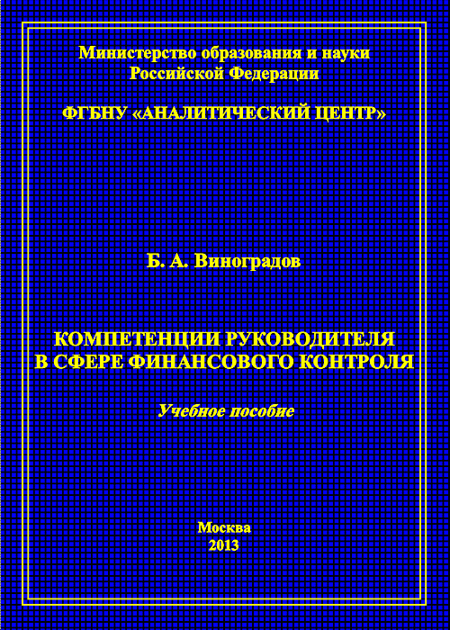 Год публикации: 2013 Виноградов Б. А. Компетенции руководителя в сфере финансового контроляУчебное пособие – М.: ФГБНУ «Аналитический центр» Минобрнауки России, 2013. – 204 с. (ISBN 978-5-904670-22-1). В учебном пособии изложены цели, задачи, структура и содержание финансового контроля, контролирующие органы и организации. Рассмотрены практические примеры финансовых нарушений и недостатков, рассмотрены вопросы аудита эффективности научной и инновационной деятельности. Проведён анализ системы внутреннего контроля в экономических субъектах. Для исследовательского университета предложена система внутреннего контроля. Книга предназначена в качестве учебного пособия для краткосрочного курса повышения квалификации в области финансового контроля руководителей различных экономических субъектов, в том числе, учреждений, предприятий и организаций (объем курса 72 часа).