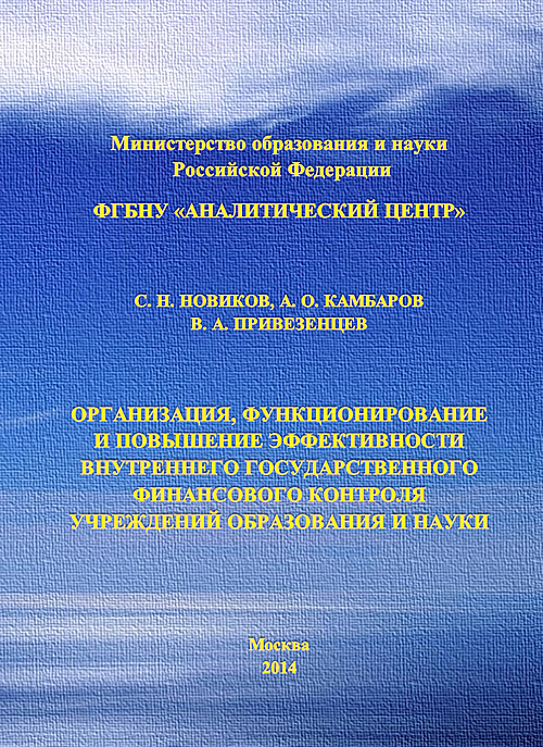 Год публикации: 2014 Новиков С. Н. Организация, функционирование и повышение эффективности внутреннего государственного финансового контроля учреждений образования и наукиМонография / С. Н. Новиков, А. О. Камбаров, В. А. Привезенцев – М.: ФГБНУ «Аналитический центр» Минобрнауки России, 2014. – 108 с. (ISBN 978-5-904670-25-2). Монография подготовлена на основе исследования законодательных и нормативных правовых актов внутреннего государственного финансового контроля и практики осуществления Министерством образования и науки Российской Федерации контроля финансово-хозяйственной деятельности находящихся в его ведении учреждений образования и науки. Результаты исследования призваны ознакомить руководящих работников и специалистов Минобрнауки России и подведомственных ему учреждений образования и науки с результатами проверок и применяемыми эффективными методами внутреннего государственного финансового контроля. По результатам исследования разработаны предложения, направленные на дальнейшее повышение эффективности внутреннего государственного финансового контроля учреждений образования и науки.