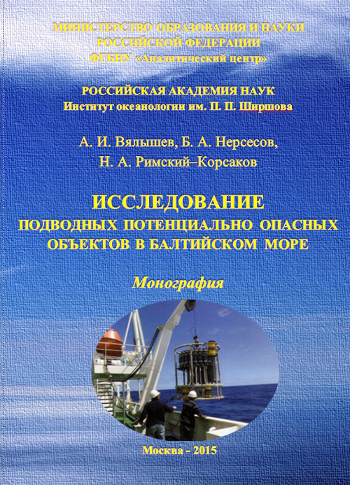 Год публикации: 2015 Вялышев А. И. Исследование подводных потенциально опасных объектов в Балтийском мореМонография / А. И. Вялышев, Б. А. Нерсесов, Н. А. Римский–Корсаков. – М.: ФГБНУ «Аналитический центр» Минобрнауки России, 2015. – 272 с.(ISBN 978-5-904670-30-6). В монографии рассмотрены география, гидрология и особенности геологических характеристик Балтийского моря. Анализируется проблема исследования подводных потенциально опасных объектов (ППОО) в акватории Балтики. Приведены их характеристики, а также технические средства поиска и обнаружения. Рассмотрены теоретические аспекты решения проблемы обнаружения ППОО. Разработана методика оценки поисковой эффективности различных подводных объектов с использованием магнитометрических средств. Приведены результаты мониторинга ППОО в разных акваториях Балтийского моря (экспедиций 2004–2007 гг.). Предложены практические рекомендации по обследованию акваторий предполагаемого нахождения ППОО.