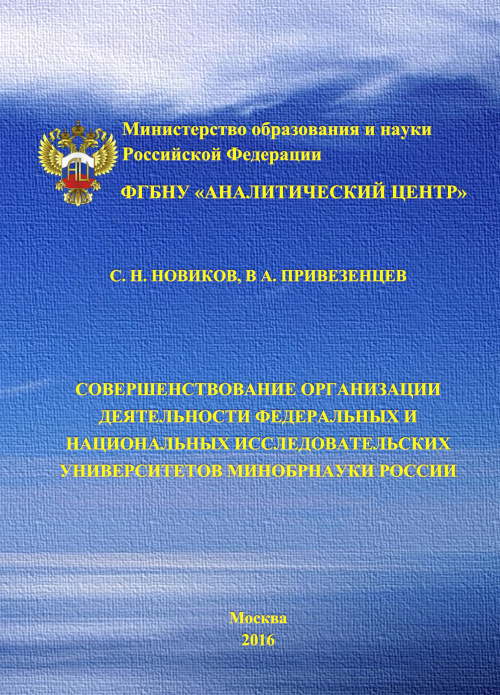 Год публикации: 2016 Новиков С. Н. Совершенствование организации деятельности федеральных и национальных исследовательских университетов Минобрнауки РоссииМонография / С. Н. Новиков, В. А. Привезенцев; под науч. ред. А. И. Володина. – М.: ФГБНУ «Аналитический центр» Минобрнауки России, 2016. – 98 с. (ISBN 978-5-904670-35-1). Монография посвящена проблемам совершенствования организации финансово-хозяйственной деятельности федеральных университетов и национальных исследовательских университетов Минобрнауки России. В ходе исследования проводился анализ законодательных и нормативных правовых актов по развитию высшего образования в Российской Федерации, опыта организации и осуществления деятельности федеральных университетов и национальных исследовательских университетов Минобрнауки России, их филиалов и иных объектов инфраструктуры, формирования и целевого использования их финансовых ресурсов из различных источников. По результатам исследования разработаны направления совершенствования организации финансово-хозяйственной деятельности федеральных университетов и национальных исследовательских университетов Минобрнауки России.