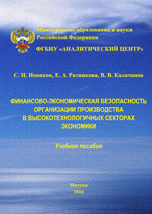 Год публикации: 2016 Новиков С. Н. Финансово-экономическая безопасность организации производства в высокотехнологичных секторах экономикиУчебное пособие / С. Н. Новиков, Е. А. Ратникова, В. В. Калачанов. – М.: ФГБНУ «Аналитический центр» Минобрнауки России, 2016. – 246 с. (ISBN 978-5-904670-36-8). Учебное пособие посвящено методическим вопросам организации производства конкурентоспособной наукоемкой продукции на предприятиях высокотехнологичных секторов экономики в условиях финансово-экономических рисков с использованием основных принципов, методов и процедур оценки, анализа и минимизации этих рисков. Предназначено для студентов и аспирантов технических и экономических университетов обучающихся по магистерским программам и профилям бакалавриата, связанным с анализом и обработкой информационных ресурсов и использованием вычислительной техники в высокотехнологичных отраслях промышленности, включая авиационную промышленность.