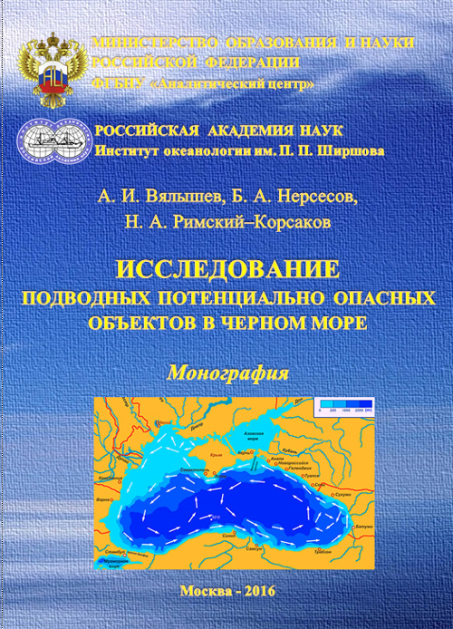 Год публикации: 2016 Вялышев А. И. Исследование подводных потенциально опасных объектов в Черном мореМонография / А. И. Вялышев, Б. А. Нерсесов, Н. А. Римский–Корсаков. – М.: ФГБНУ «Аналитический центр» Минобрнауки России, 2016. – 284 с. (ISBN 978-5-904670-38-2). В монографии рассмотрены география, гидрология и особенности геологических характеристик Черного моря. Анализируется проблема исследования подводных потенциально опасных объектов (ППОО) в акватории Черноморья. Приведены их характеристики, а также технические средства поиска и обнаружения. Рассмотрены теоретические аспекты решения проблемы обнаружения ППОО. Разработана методика оценки поисковой эффективности различных подводных объектов с использованием магнитометрических средств. Приведены результаты мониторинга ППОО в разных акваториях Черного моря (экспедиций 2006–2011 гг.). Предложены практические рекомендации по обследованию акваторий предполагаемого нахождения ППОО.