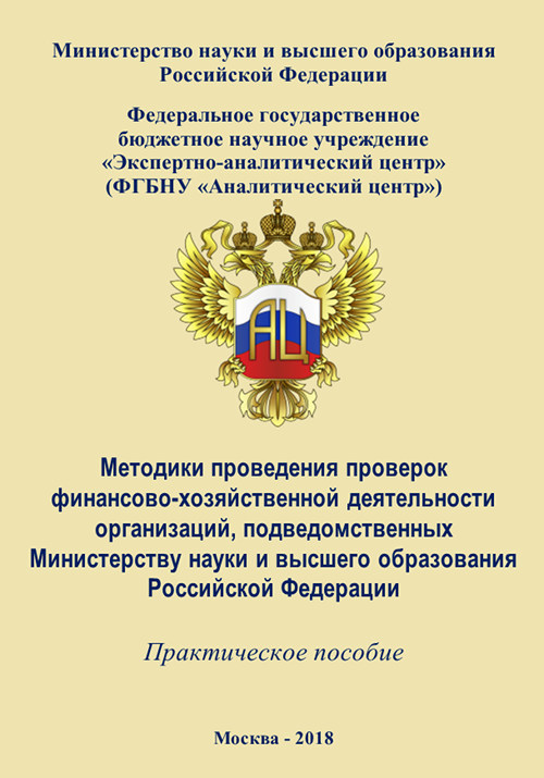 Год публикации: 2018 Бондарчук Д. В. Методики проведения проверок финансово-хозяйственной деятельности организаций, подведомственных Министерству науки и высшего образования Российской ФедерацииПрактическое пособие / Д. В. Бондарчук, С. В. Анюшин, О. А. Коробко [и др.]; под общ. ред. канд. экон. наук А. И. Володина. – М.: ФГБНУ «Аналитический центр» Минобрнауки России, 2018. – 113 с. (ISBN 978-5-904670-48-1). Практическое пособие предназначено для ознакомления сотрудников, работающих в системе внутреннего контроля, с типовыми методиками проведения проверок финансово-хозяйственной деятельности организаций, подведомственных Министерству науки и высшего образования Российской Федерации. В пособии представлены типовые методики, разработанные и используемыми в ходе проведения контрольных мероприятий сотрудниками ФГБНУ «Аналитический центр». К числу рассматриваемых направлений проверок относятся: план финансово-хозяйственной деятельности, порядки оплаты труда и выплаты стипендий, средства на командировочные расходы, учёт медицинских препаратов и других материальных запасов медицинского назначения, соблюдение порядка поступления, учёта и списания основных средств, использования субсидий, выделяемых Минобрнауки России на научно-исследовательские работы, использование средств, выделяемых на капитальное строительство, реконструкцию и капитальный ремонт объектов организаций, проведение инвентаризации основных средств и материальных запасов и т.д.