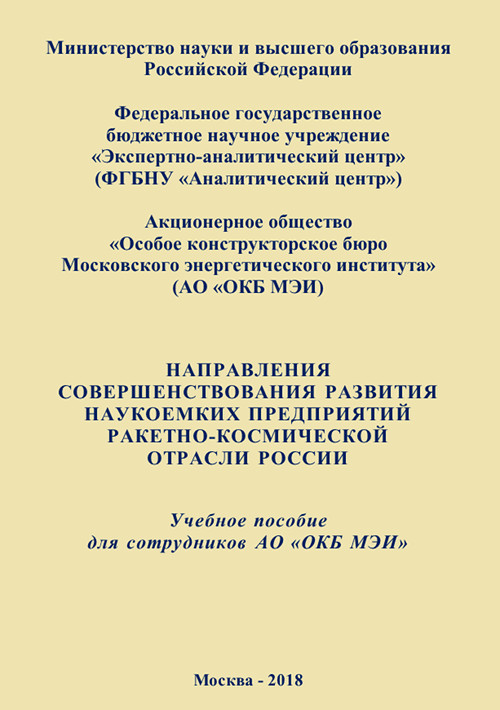 Год публикации: 2018 Направления совершенствования развития наукоемких предприятий ракетно-космической отрасли РоссииУчебное пособие для сотрудников АО «ОКБ МЭИ» / А. С. Чеботарев [и др.]; под науч. ред. д-ра техн. наук. проф. А. С. Чеботарева. – М.: ФГБНУ «Аналитический центр» Минобрнауки России, 2018. – 145 с. (ISBN 978-5-904670-51-1). Учебное пособие посвящено изучению основных направлений повышения эффективности производства и улучшения качества создаваемой АО «ОКБ МЭИ» аппаратуры и продукции, а также вопросам кадрового обеспечения организации. Рассмотрены вопросы в области развития основных видов и направлений деятельности предприятия. Пособие предназначено для сотрудников, специалистов и руководителей АО «ОКБ МЭИ».