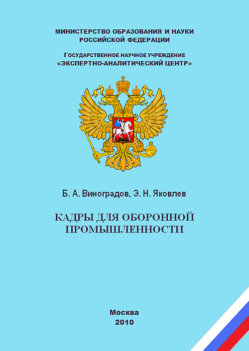 Год публикации: 2010 Виноградов Б. А. Кадры для оборонной промышленностиМонография / Б. А. Виноградов, Э. Н. Яковлев; под общ. ред. д-ра экон. наук, проф. Э. Н. Яковлева. – М.: Государственное научное учреждение «Экспертно-аналитический центр» Минобрнауки России, 2010. – 167 с. (ISBN 978-5-904670-09-2). В монографии рассматриваются проблемы подготовки кадров для оборонных предприятий России в соответствии с потребностями инновационного развития страны. Сформулированы основные задачи, стоящие перед системой подготовки кадров для сферы ОПК. Проведён анализ и разработаны концептуальные подходы к построению системы развития кадрового потенциала, выработаны практические предложения по структурным и институциональным преобразованиям. Книга предназначена для специалистов, научных сотрудников и руководителей, занимающихся проблемами управления социально-экономическими системами.