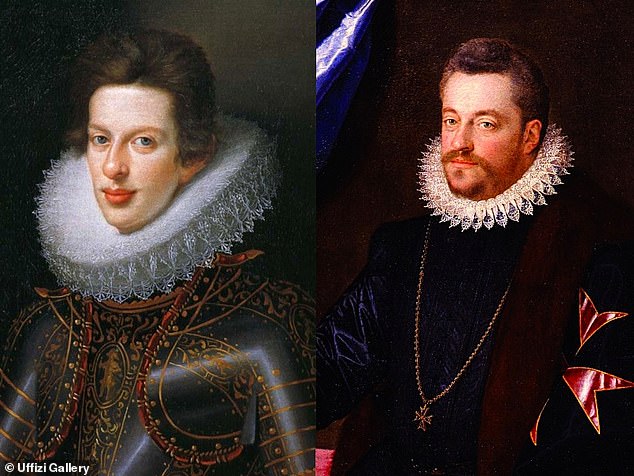 Изображение источника: Козимо II Медичи (слева) и его отец Фердинандо I (справа) были членами Дома Медичи, самой могущественной семьи правителей в Италии эпохи Возрождения. Фрески обоих мужчин были обнаружены в галерее Уффици. Изображение: источника. Источник: dailymail.co.uk