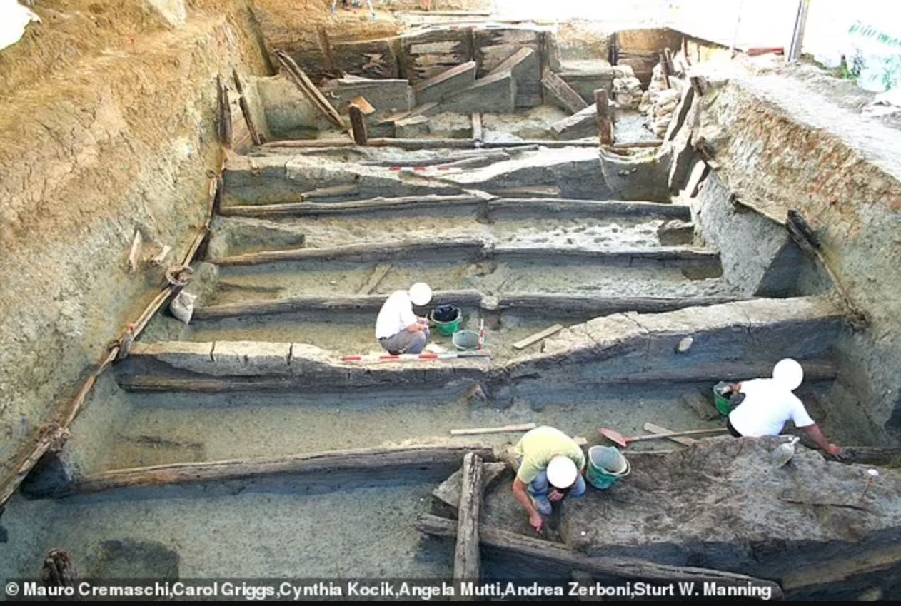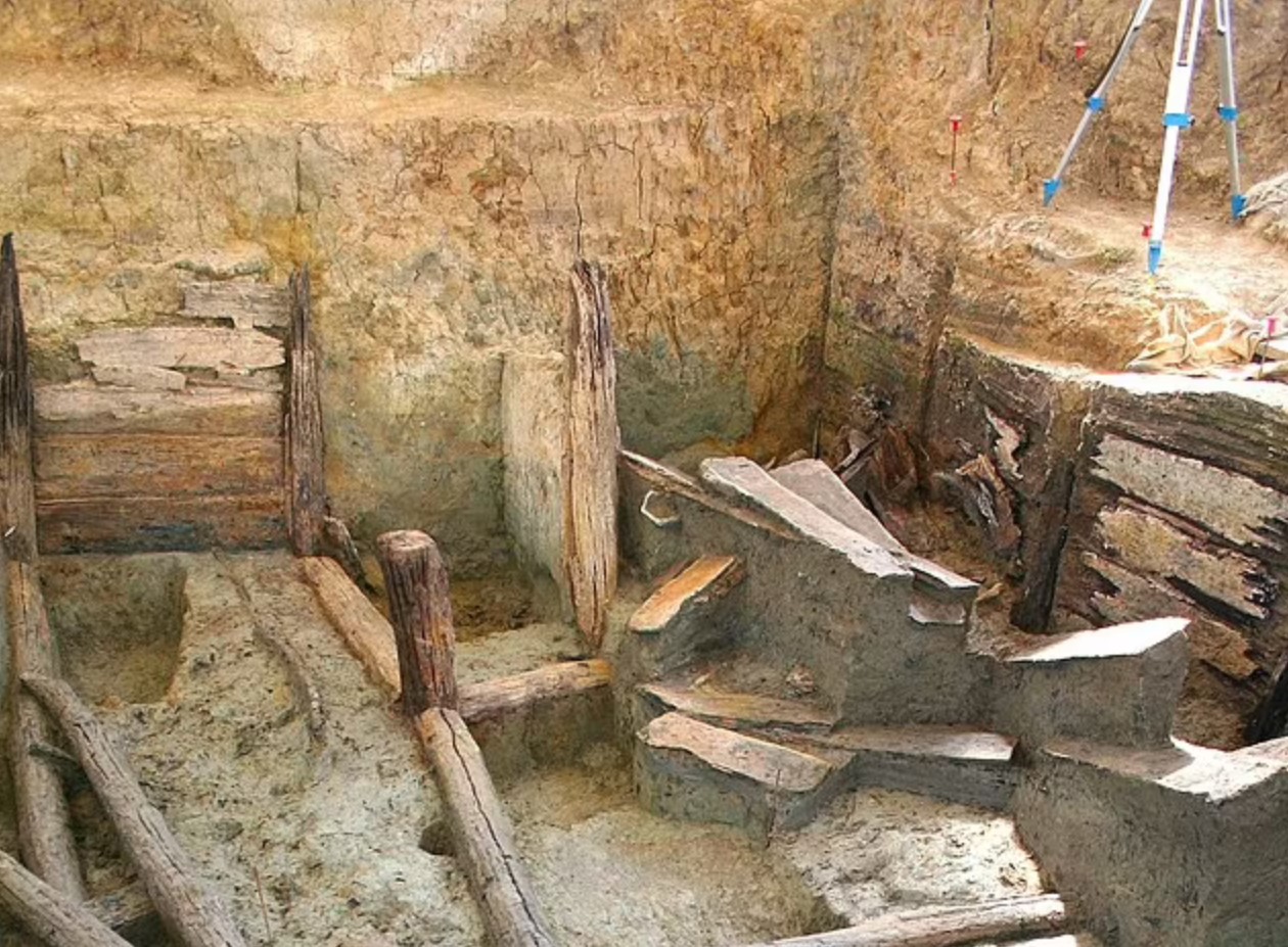 Деревянные столбы, балки и доски образовывали внешнюю часть бассейнов и укрепляли стены глубокой ямы, в которой когда-то находилась вода. Яма примерно 40 футов (12,19м) в длину, 23 фута (7м) в ширину и более 10 футов (3м) в глубину. Группа археологов во главе со специалистами из Корнеллского университета (Cornell University) также нашла на дне ямы ряд артефактов, в том числе керамические сосуды и фигурки, которые, по их мнению, использовались в качестве подношений во время сверхъестественных ритуалов. Используя данные радиоуглеродного анализа и датирование годичных колец, исследователи определили, что нижний резервуар был построен в 1444 году до нашей эры, а другой резервуар был построен наверху в 1432 году до нашей эры. Пейзажный бассейн, названный Noceto Vasca Votiva, впервые был обнаружен в 2015 году на небольшом холме на равнине По, между Альпами и Апеннинами. Памятник сделан из дуба и состоит из двух наложенных друг на друга резервуаров, которые отражают небо и казались другим царством тем, кто поклонялся на этом месте. Изображение: источника. Деревянные столбы, балки и доски формируют внешний вид бассейнов и укрепляют стены глубокой ямы, в которой когда-то находилась вода. Изображение: источника. Источник: dailymail.co.uk