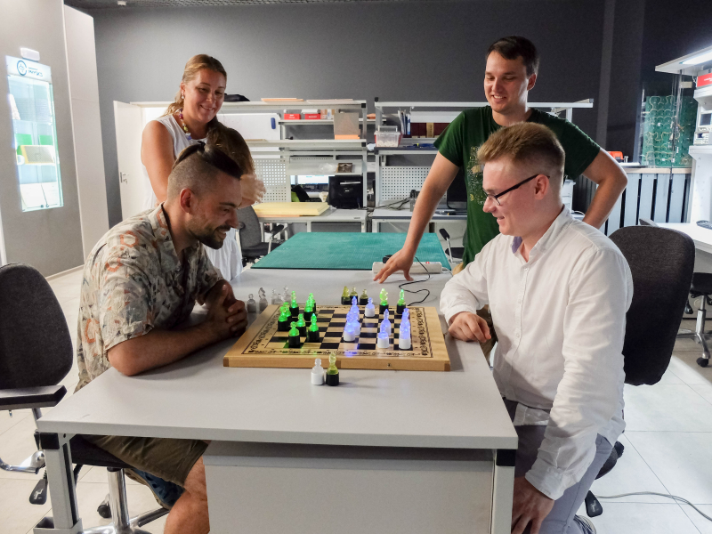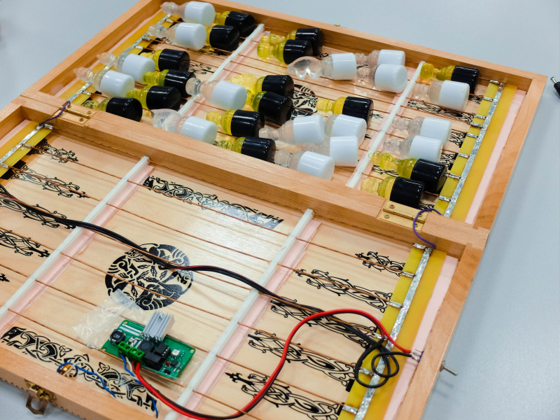 Дата публикации: 22 июля 2021 г. #ИГРЫ ИТМО: ученые сделали прототип светящихся шахмат на основе нано- и метаматериаловК международному дню шахмат команда Нового физтеха представила уникальную разработку — набор шахмат, фигурки в котором подсвечиваются за счет внедренного в них перовскитного материала. При этом энергия для свечения передается беспроводным способом к каждой фигурке за счет уникального передатчика, встроенного в шахматную доску. Изображение: источника. «Внутри фигурок — светодиод, который подсвечивает перовскитные квантовые точки, внедренные в материал фигурки. Энергию к светодиоду мы подводим беспроводным методом — для этого мы встроили большой передатчик непосредственно в шахматную доску. Уникальность этого передатчика в том, что он реализован на основе метаповерхности. Это позволяет нам создать квазиравномерное распределение магнитного поля и сильно подавить электрическое поле, вредное для человека. При помощи магнитного поля происходит передача энергии к каждому из приемников, встроенных в шахматных фигурках. Сигнал выпрямляется — и зажигается светодиод, подсвечивает материал, внутри которого внедрены квантовые точки, и мы наблюдаем их люминесценцию», — объясняет Полина Капитанова. Свечение фигуркам придают нанокристаллы свинцово-галогенидногоперовскита — материала, который в природе не может существовать из-за своей подверженности воздействию воды и воздуха. Здесь же перовскит защищен полиэфирными смолами, что делает его максимально стабильным. Впрочем, одним из главных вызовов при сборке шахматной установки стала сложная форма шахматных фигур: как признаются ученые, было очень трудно подобрать оптимальные параметры поглощения и равномерного излучения света в фигурках.