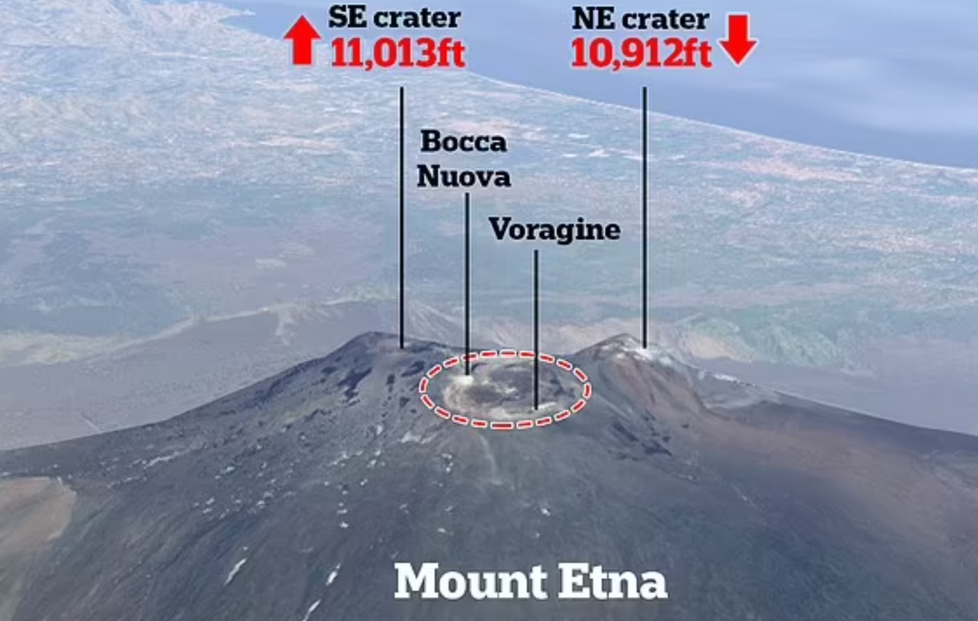 Северо-восточный кратер Этны достиг рекордной высоты 10 990 футов (3349 м) в 1981 году, но обрушение на его краях уменьшило его до 10912 футов (3326м), зафиксированного в 2018 году. Спутник предполагает, что юго-восточный кратер превзошел это значение и составляет 11013 футов (3357м). Этна - самый активный вулкан Европы, производящий ежегодно столько лавы, чтобы заполнить 108-этажный небоскреб. С февраля он выпускает дым и пепел, загрязняя улицы, замедляя движение транспорта и повреждая посевы. Хотя это представляет небольшую опасность для окружающих деревень, по оценке правительства Сицилии в июле, в рамках операции по очистке к настоящему времени было собрано 300 000 метрических тонн золы. «Благодаря анализу и обработке спутниковых изображений юго-восточный кратер сейчас намного выше своего «старшего брата», северо-восточного кратера, который в течение 40 лет был бесспорным пиком Этны», - говорится в пресс-релизе INGV.