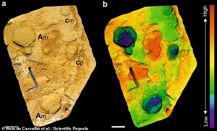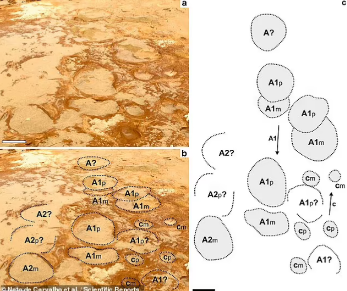 Дата публикации: 17 сентября 2021 г. Лиссабонский университете: в Испании нашли роддом слонов, которому 129 000 летНа юго-западе Испании, ученые обнаружили окаменелые следы, анализ которых показал, что это мог быть питомник слонов 129 000 лет тому назад. Анализ серии окаменелых следов (на фото) на юго-западе Испании показал, что это место было питомником доисторических слонов около 129000 лет назад. Основываясь на округло-эллиптическом характере следов, а также на других особенностях формы, команда пришла к выводу, что следы были оставлены слонами с прямыми клыками (справа) Исследователи из Лиссабонского университета исследовали 34 набора следов на «Вытоптанной поверхности Маталасканьяс», которая сохранилась недалеко от города Уэльва (Huelva). Анализируя размеры каждого отпечатка, команда смогла оценить рост и массу - и, соответственно, возраст - слонов, которые проложили каждый след. Следы оставили 14 маленьких детенышей, восемь слонов в возрасте 2–7 лет, шесть подростков (8–15 лет) и пять взрослых особей, намекая на использование этого места в качестве репродуктивного участка. В то время, когда в позднем плейстоцене были проложены следы, на покрытом дюнами ландшафте был пруд, который обеспечивал водоснабжение и растительность для еды. Анализируя размеры каждого отпечатка, команда смогла оценить рост и массу - и, соответственно, возраст - слонов, которые проложили каждый след. На фото: некоторые из отпечатков (вверху слева), показаны с аннотациями (внизу слева) и на иллюстрации (справа) Исследование было предпринято палеобиологом Карлосом Нето де Карвалью (Carlos Neto de Carvalho) из Лиссабонского университета (University of Lisbon) и его коллегами. Основываясь на округло-эллиптической природе следов, а также на других особенностях формы, команда пришла к выводу, что следы были оставлены слонами с прямыми клыками. Этот вид - формально известный как Palaeoloxodon antiquus - является близкими родственниками африканских лесных слонов, которых мы знаем из настоящего. Основываясь на анализе отпечатков, команда пришла к выводу, что каждый из четырех детенышей, которые шагали через участок, были в возрасте от 0 до 2 лет, а некоторые весили от 154 до 441 фунтов (70–200 кг). Считается, что три из следов взрослых особей были оставлены самками слонов (исходя из их близости к следам детенышам). Два других набора отпечатков, длина которых составляла около 20 дюймов (50 см), скорее всего, были сделаны взрослыми мужчинами весом около семи тонн. По мнению исследователей, вполне вероятно, что слоны-самцы редко посещали участок Маталасканьяс. h Наряду со следами слона команда также нашла следы неандертальца. «Предполагается, что неандертальцы посещали топтанную поверхность Маталасканьяс, чтобы охотиться». Полные результаты исследования опубликованы в журнале Scientific Reports.. Источник: dailymail.co.uk