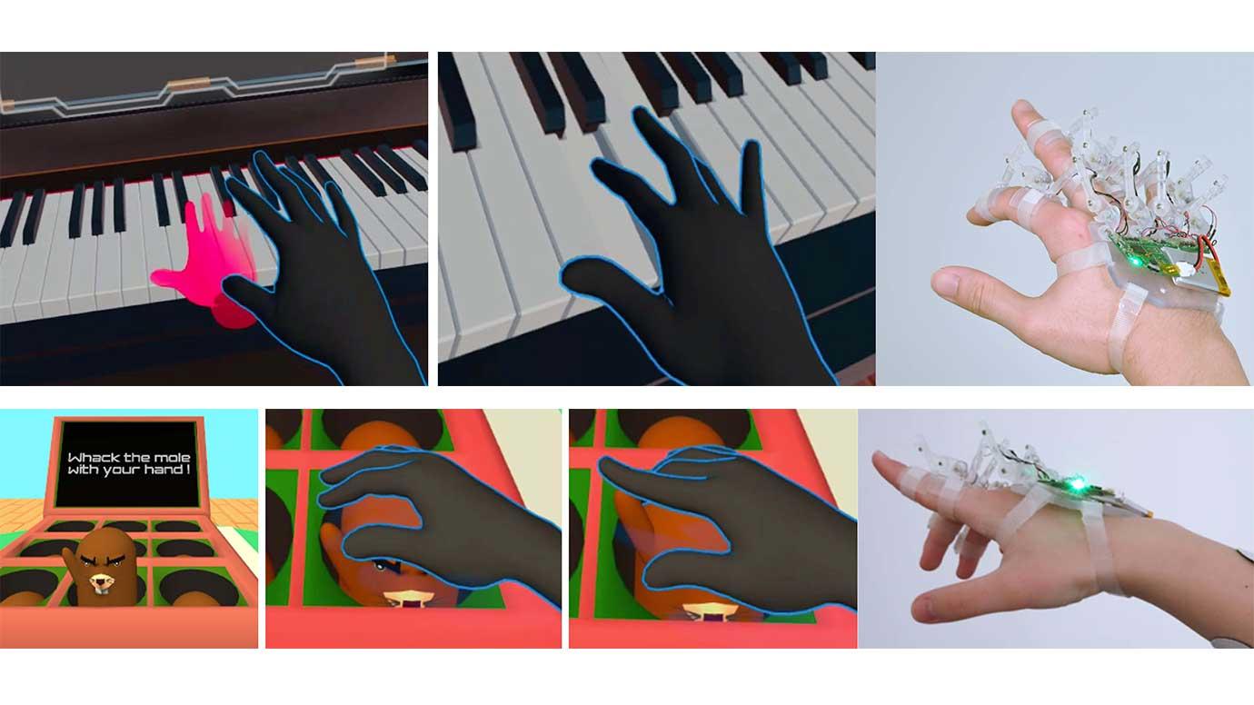 Дата публикации: 26 октября 2021 г. Чикагский университет: носимое устройство позволит управлять пальцамиВ Университете Чикаго разработали носимое устройство, которое поможет более точно набирать текст на смартфоне, играть на гитаре и фортепьяно, либо разговаривать на языке жестов. Ученые из Чикаго используют электрическую стимуляцию для точного движения. DextrEMS, носимое устройство, сочетающее электрическую стимуляцию мышц и механический тормоз для управления отдельными пальцами. Фото любезно предоставлено Лабораторией интеграции человеческого компьютера. Печатать на клавиатуре или телефоне, разговаривать на языке жестов или играть на гитаре или фортепиано требуют точно настроенных движений и координации. Новое решение Лаборатории интеграции человека и компьютера Чикагского университета (University of Chicago’s Human Computer Integration Laboratory) под руководством доцента Педро Лопеса (Pedro Lopes) решает проблему с помощью комбинации электрической стимуляции мышц (EMS) и механического торможения. DextrEMS, тактильное устройство, изобретенное и разработанное учениками Лопеса с факультета компьютерных наук: Роменом Нитом (Romain Nith), Шан-Юань Тэном (Shan-Yuan Teng), Пэнъю Ли (Pengyu Li) и Юцзе Тао (Yujie Tao), аккуратно ложится на руку пользователя. Когда электроды EMS на предплечье перемещают пальцы в желаемое положение, суставах пальцев фиксируются в целевом жесте и ограничивают нежелательное движение других пальцев. Работа была представлена на прошлой неделе на симпозиуме – 2021 ACM Symposium on User Interface Software and Technology (UIST), одной из ведущих конференций по взаимодействию человека с компьютером. «DextrEMS - это средство, позволяющее управлять пальцами человека через компьютер», - сказал Ромен Нит. «Это та же идея, что и у традиционного экзоскелета, где мы обеспечиваем силовую обратную связь для пальцев, но мы хотели решить эту проблему с точки зрения миниатюризации всего. Комбинируя EMS и тормоза, мы можем создавать движения, которые раньше были невозможны, и пользователи могут двигать пальцами независимо». На этом изображении в верхнем ряду показано, как DextrEMS может управлять пальцами пользователя, чтобы научить их правильным позициям для игры на фортепиано. В нижнем ряду показано, как сочетание DextrEMS с виртуальной реальностью может имитировать тактильные ощущения; в этом случае пользователь, играющий в игру «Ударь крота», может «почувствовать» появляющуюся родинку, толкающуюся ему в руку. Фото любезно предоставлено Лабораторией интеграции человеческого компьютера. Источник: news.uchicago.edu
