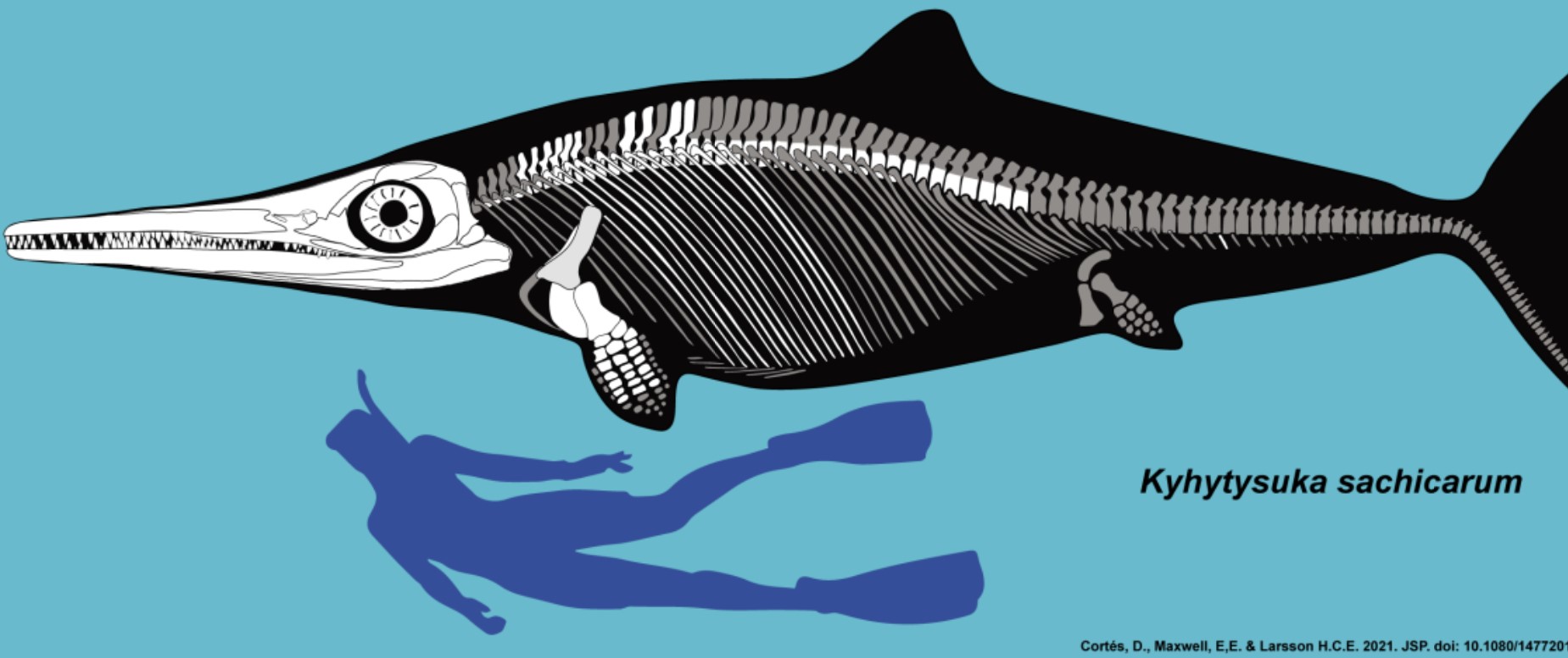 Дата публикации: 01 декабря 2021 г. Университет Макгилла: ученые нашли рыбу-меч, жившую 130 миллионов лет тому назадМеждународная группа ученых из Канады, Колумбии и Германии обнаружила новую морскую рептилию. Окаменелость возрастом 130 миллионов лет, является одним из последних выживших ихтиозавров - древних животных, которые устрашающе похожи на живых рыб-меч. Реконструкции жизни Kyhytysuka sachicarum из раннего мела Колумбии. Предоставлено: Дирли Кортес. «У этого животного появились уникальные зубы, которые позволили ему есть крупную добычу», - говорит Ханс Ларссон (Hans Larsson), директор музея Редпат в Университете Макгилла (Director of the Redpath Museum at McGill University). «В то время как у других ихтиозавров были маленькие зубы одинакового размера для кормления мелкой добычей, этот новый вид изменил размер и расстояние между зубами, чтобы создать арсенал зубов для уничтожения крупной добычи, такой как большая рыба и другие морские рептилии».