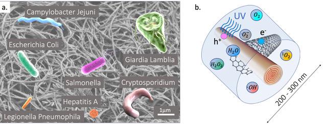 Дата публикации: 13 апреля 2022 г. EPFL: солнечный фильтр открывает доступ к чистой водеУченые из EPFL разработали фильтр для очистки воды, который работает на солнечной энергии. Новая разработка может снабжать чистой питьевой водой небольшое поселение даже в отдаленных районах и его можно легко масштабировать. Изображение: источника. По данным Всемирной организации здравоохранения (ВОЗ), не менее 1,8 миллиарда человек потребляют загрязненную воду, а к 2040 году большая часть мира будет испытывать водный стресс из-за нехватки ресурсов питьевой воды. Стало крайне важно разработать эффективные и экономичные способы обеззараживания воды. Группа ученых во главе с Ласло Форро (László Forró) из Федеральной политехнической школы Лозанны (École polytechnique fédérale de Lausanne, EPFL), разработала новый фильтр для очистки воды, который сочетает в себе нанопроволоки из диоксида титана (TiO2) и углеродные нанотрубки, питаемые только солнечным светом. Ученые впервые показали, что нанопроволоки TiO 2 сами по себе могут эффективно очищать воду при наличии солнечного света. Но переплетение нанопроволок с углеродными нанотрубками образует композитный материал, который добавляет дополнительный слой обеззараживания путем пастеризации воды, убивая патогены человека, такие как бактерии и крупные вирусы. Идея состоит в том, что когда ультрафиолетовый свет из видимого спектра солнечного света попадает на фильтр, он заставляет его производить группу молекул, называемых активными формами кислорода (АФК). К ним относятся перекись водорода (H2o2), гидроксид (OH) и кислород (O2-), которые, как известно, являются эффективными убийцами патогенов.