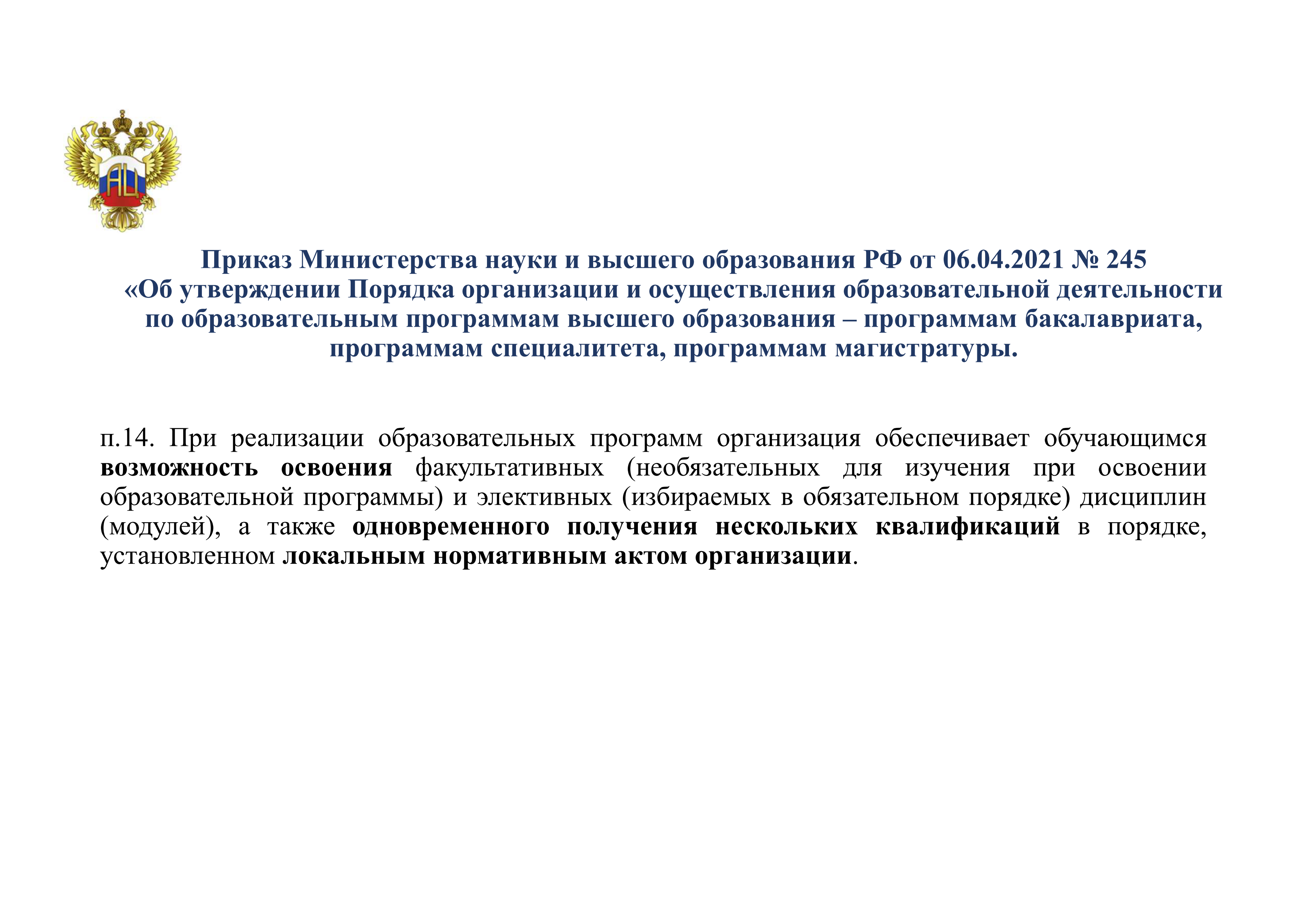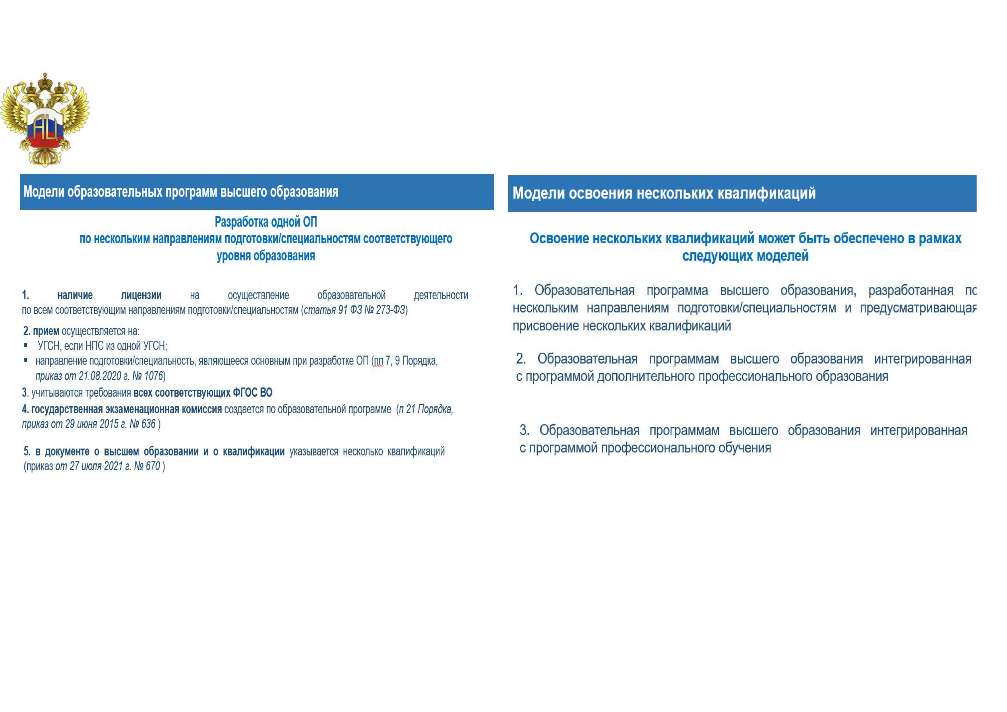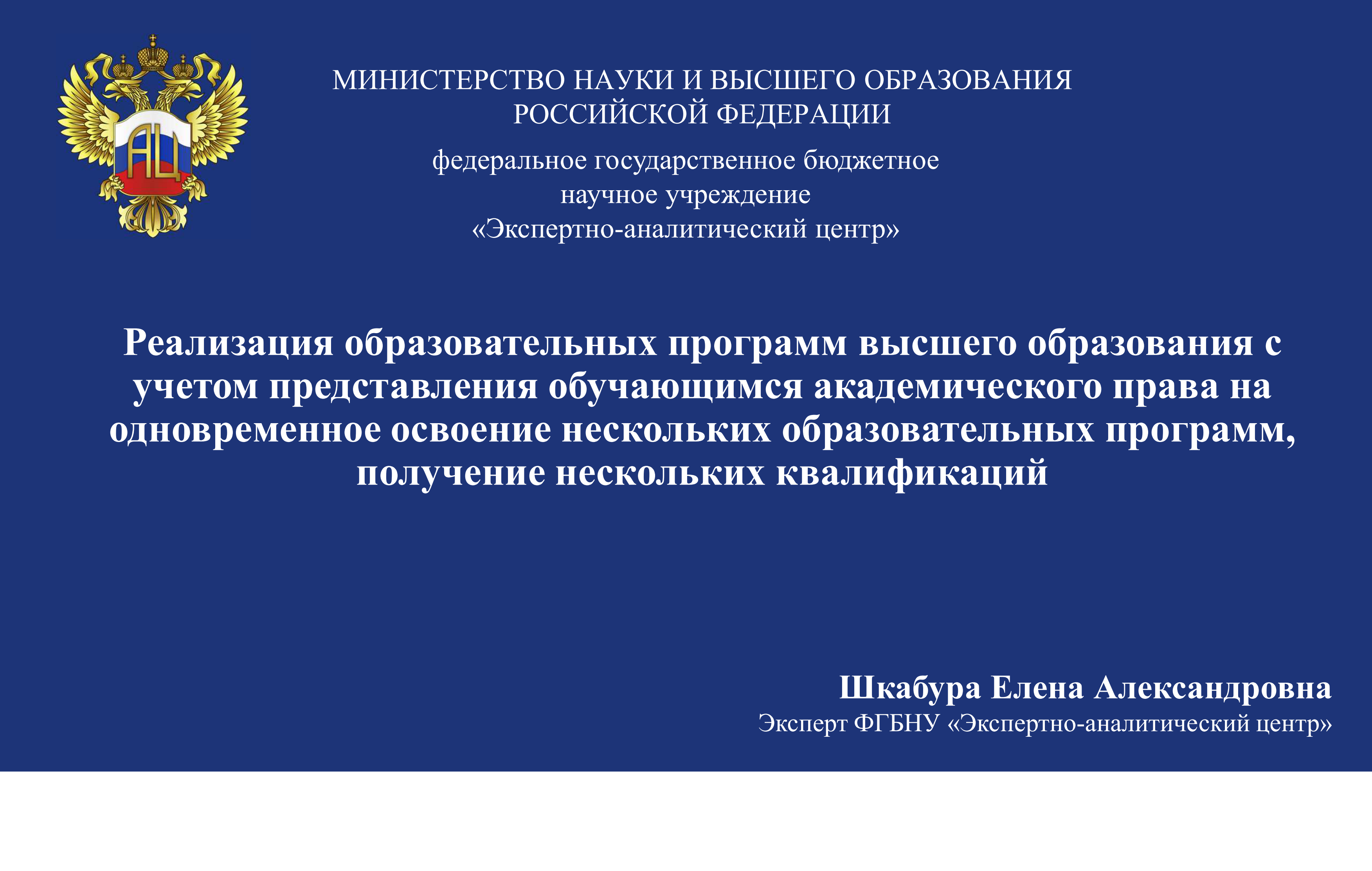 Дата публикации: 26 декабря 2022 г. Реализация образовательных программРеализация образовательных программ высшего образования с учетом представления обучающимся академического права на одновременное освоение нескольких образовательных программ, получение нескольких квалификаций