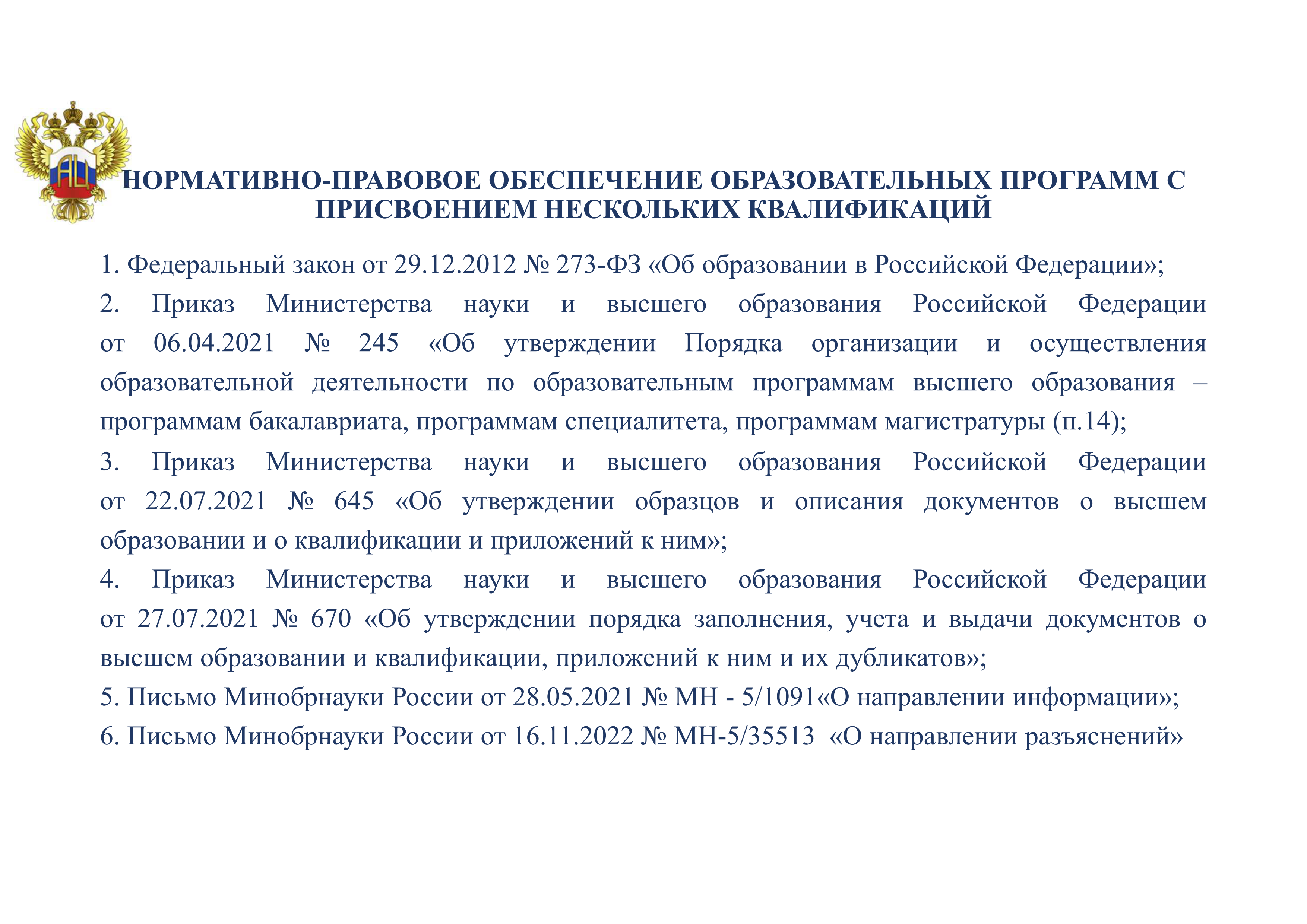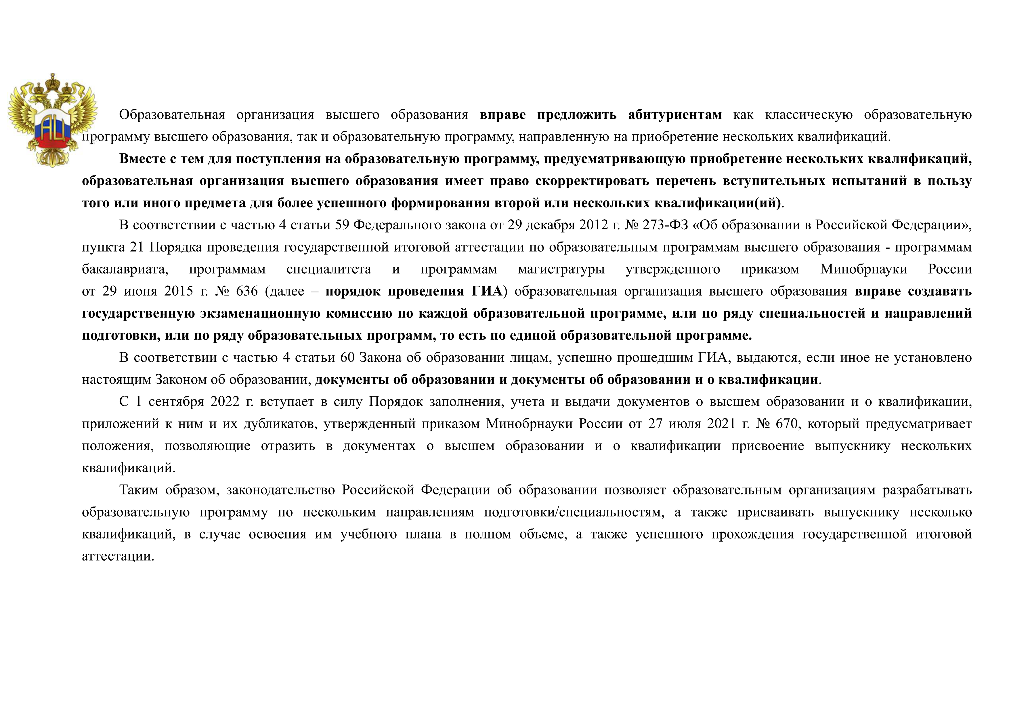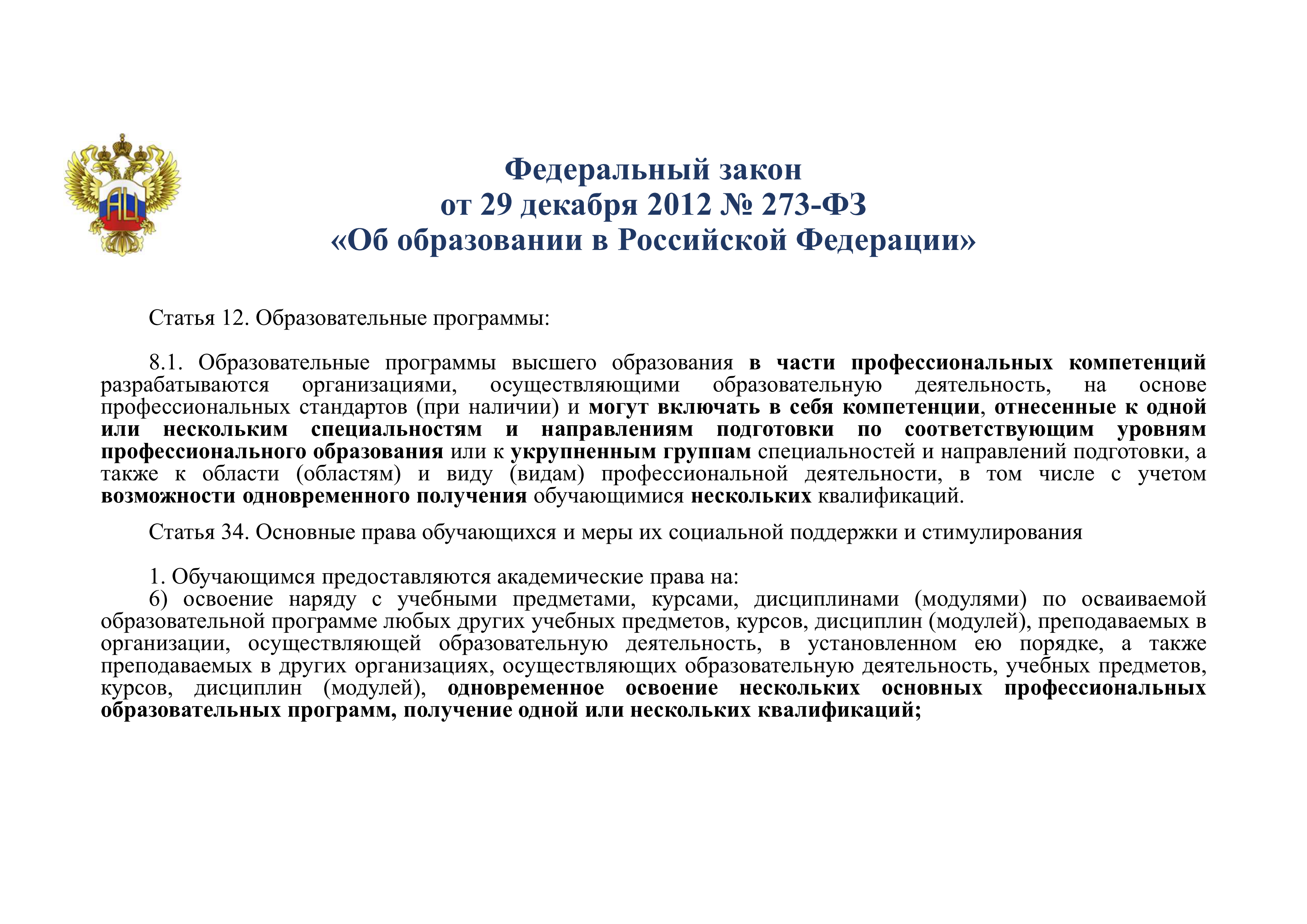 Дата публикации: 26 декабря 2022 г. Реализация образовательных программРеализация образовательных программ высшего образования с учетом представления обучающимся академического права на одновременное освоение нескольких образовательных программ, получение нескольких квалификаций