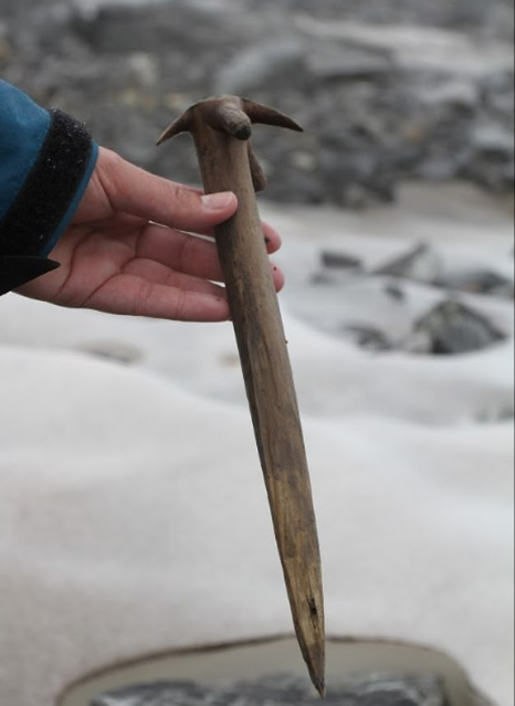 Дата публикации: 21 апреля 2020 г. В Норвегии нашли артефакты эпохи викингов, которым до 1700 лет, включая вязаные варежки, деревянный венчик и сломанную трость с рунической надписьюВ результате таяния ледников в Норвегии ученые обнаружили древние артефакты, брошенные на обочине дороги более 1000 лет назад. Одежда, инструменты, снаряжение и кости животных были найдены на горном перевале в Лендбрине (Lendbreen) в горном регионе Норвегии. В число более 100 артефактов входят подковы, деревянный венчик, трость, деревянная игла, варежка и маленький железный нож. Команда также нашла замерзший череп лошади, которая несла груз. Объекты, которые находились во льду, показывают, что этот перевал использовался в железном веке, примерно с 300 г. до н.э. до 14 века.